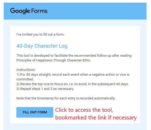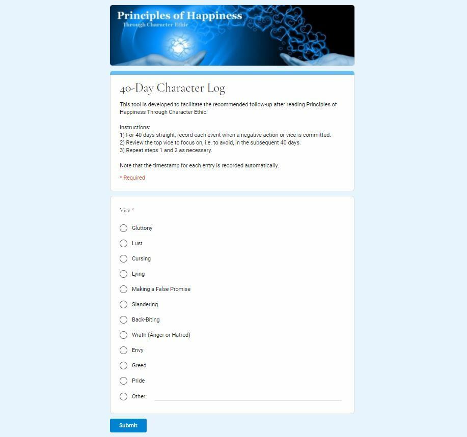 This tool is developed to facilitate the recommended follow-up after reading Principles of Happiness Through Character Ethic.